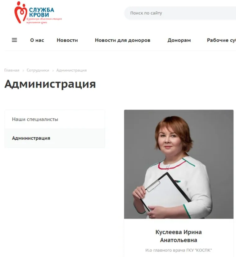 «Ирина Куслеева — и.о. главного врача ГКУ „КОСПК“», — указано на сайте станции переливания крови. Куслеева — врач анестезиолог-реаниматолог, ранее работала в Курганской областной клинической больнице.