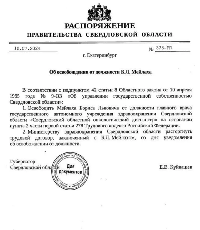 «Освободить Мейлаха Бориса Львовича от должности главного врача „Свердловского областного онкологического диспансера“ на основании пункта 2 части первой статьи 278 Трудового кодекса РФ», — говорится в документе, подписанном 12 июля.