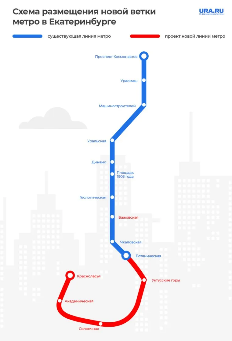 «Планируется строительство как минимум четырех новых станций: „Краснолесья“ (на пересечении улиц Краснолесья и Анатолия Мехренцева), „Академическая“ (за Преображенским парком), „Солнечная“ (на пересечении улиц Чемпионов и Лучистой, где трамвайное кольцо), „Уктусские горы“ (улица Походная, Уктус Правобережный)», — передал собеседник. С его слов URA.RU подготовило инфографику, как это может выглядеть.