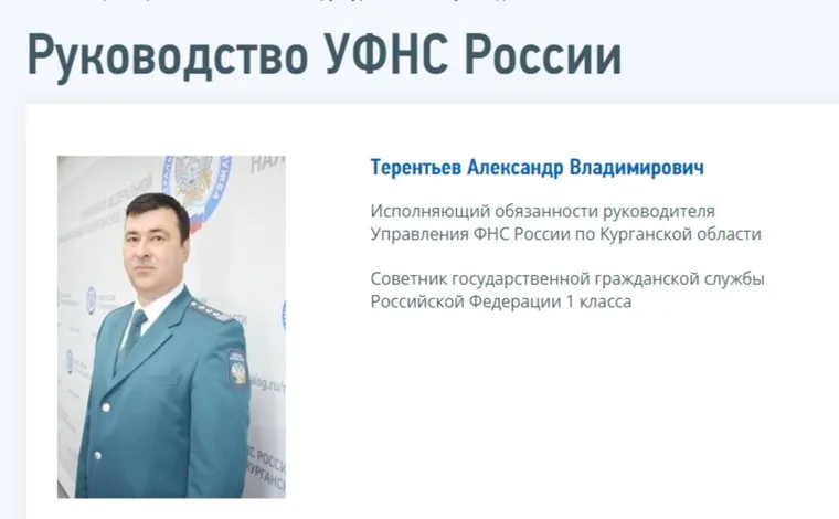«Исполняющий обязанности руководителя Управления ФНС России по Курганской области — Терентьев Александр Владимирович», — указано в разделе руководство. На руководящую должность Терентьев назначен после перевода своего бывшего начальника Марата Сагитуллина в Екатеринбург.