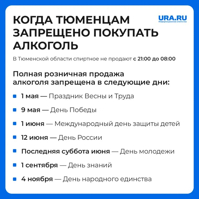 По областному законодательству, в Тюменской области существуют дни, когда алкоголь в магазинах нельзя купить и в разрешенное время. Связано это с крупными праздниками. В частности, полный запрет действует: