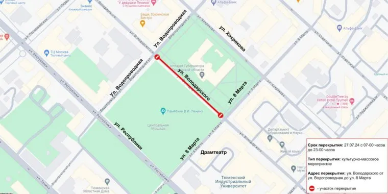 В Тюмени 24 июля на целый день перекроют проезд по улице Володарского вдоль регионального правительства. Об этом сообщает telegram-канал «Тюмень. Администрация города».