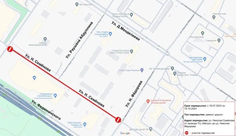 Движение будет запрещено на участке от проезда к ТЦ «Метро» до улицы Николая Федорова. Для объезда предлагают использовать улицы Дмитрия Менделеева и Федюнинского.