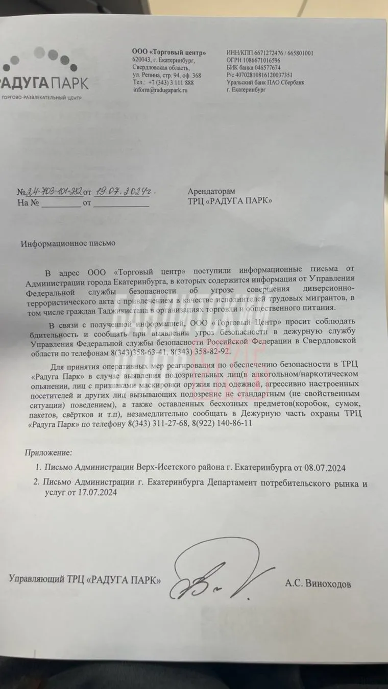 «В „Радуга Парке“ тревога, всех просят покинуть торговый центр. Также к нам попал документ о том, что накануне появилась угроза совершения террористического акта в ТЦ», — передает telegram-канал «Бандитский Центр» слова очевидца.