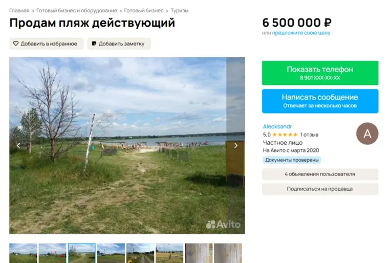 «Продам пляж действующий [за] 6 500 000 рублей. [Бизнес расположен] в Челябинской области, Еткульском районе, Печенкинском сельском поселении», — говорится в объявлении на сайте «Авито».