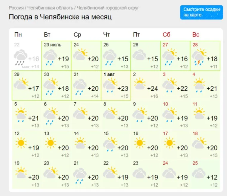 В остальные дни в Челябинске температура воздуха днем составит около 20 градусов, ночью — около 13 градусов. 25 августа похолодает до 12 градусов. Дождливые дни ожидаются в каждую неделю лета.