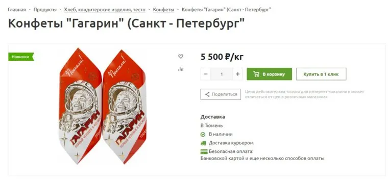 На одном из рынков Тюмени продают килограмм конфет «Гагарин» стоимость 5 500 рублей. Информация о товаре указана на сайте продуктовой точки.