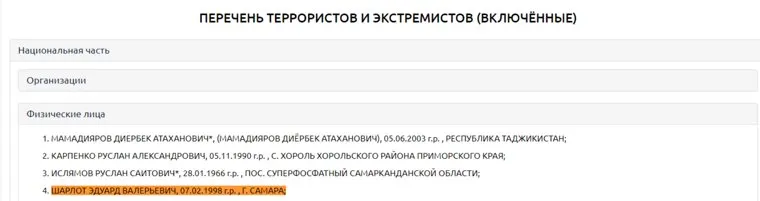 «Шарлот Эдуард. 07.02.1998 года рождения. Самара», — отмечается в соответствующем перечне Росфинмониторинга.