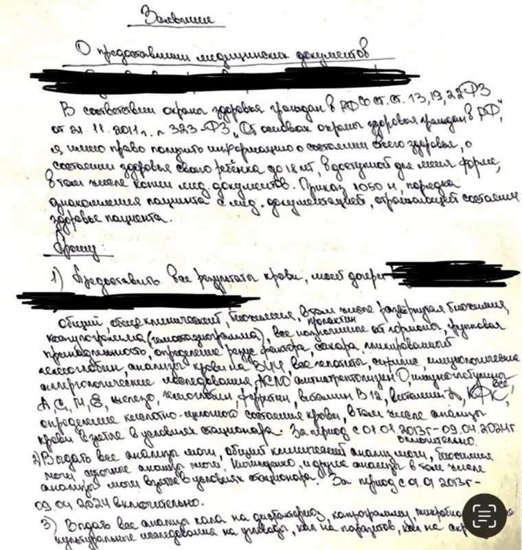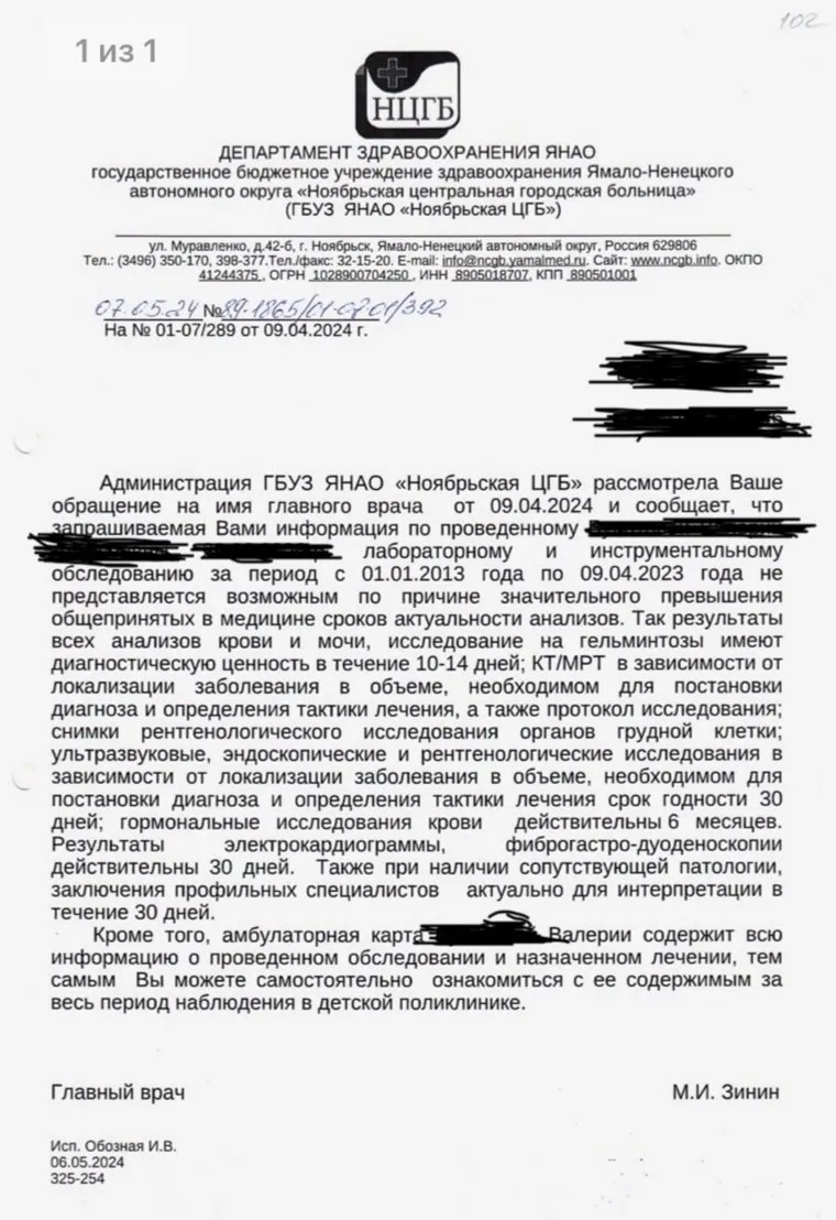 В ответе на официальный запрос родителя было указано, что выдача запрашиваемой информации по проведенному лабораторному и инструментальному обследованию за период с 01.01.2013 года по 09.04.2023 года не представляется возможным. Причина — значительное превышение общепринятых в медицине сроков актуальности анализов.