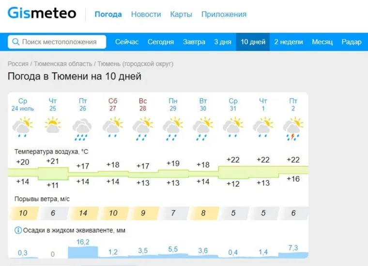 "В пятницу, 26 июля, в Тюмени ожидается ливень. В течение суток выпадет около 16 мм осадков“, — говорится в прогнозе ресурса.