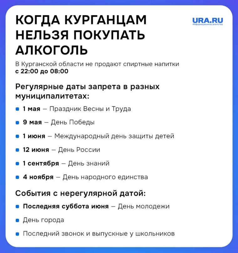 В Курганской области действует ограничение на розничную продажу алкогольных напитков с 22:00 до 08:00. Однако помимо этих часов, есть особые дни, когда продажа алкоголя запрещена в течение всего дня. Это связано с проведением крупных праздников и массовых мероприятий.