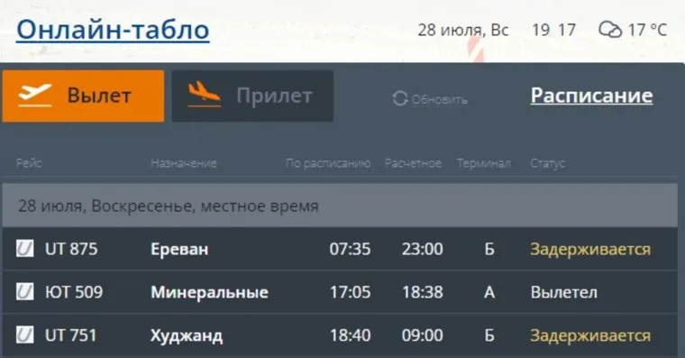 «Рейс авиакомпании Utair из Тюмени в Ереван должен был вылететь 28 июля в 7:35, но время перенесено на 28 июля в 23:00. Рейс авиакомпании Utair из Тюмени в Худжанд также задержан — время вылета по расписанию 28 июля в 18:40, расчетное время вылета — 29 июля в 9:00», — следует из данных онлайн-табло. На данный момент задержка рейса в Ереван составляет чуть более 15 часов, а рейс в Худжанд перенесен на 14 часов 20 минут.
