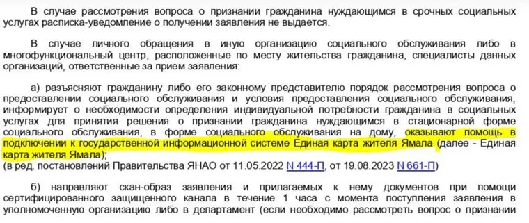 Корреспондент агентства обратился в центр социального обслуживания населения «Доверие». Там объяснили, в соответствии с постановлением правительства ЯНАО «О порядке предоставления социальных услуг поставщиками социальных услуг» заявление на оказание услуг принимаются при условии наличия единой карты жителя ЯНАО.