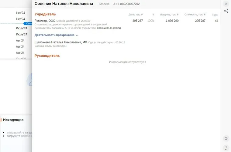 Учредителем и владельцем компании является Наталья Соляник. Директором с февраля 2021 года выступает Артем Кальной. И тот, и другой ИП имеют московскую регистрацию. Однако, что интересно, и у Соляник, и у Кального есть туманное северное прошлое — в виде прекративших деятельность ИП и компаний. За Кальным числится руководство некоей ООО «АТС», которая занималась грузовыми перевозками в Сургуте. В этом же городе работал ИП Наталья Щелгачева (судя по всему — предыдущая фамилия Соляник), торговавший одеждой.