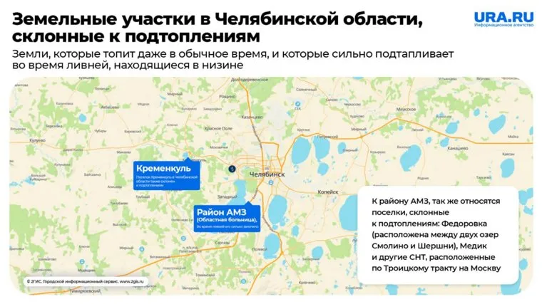 Она добавила, что в самом Челябинске сильно топит участки в поселках и СНТ, расположенных на АМЗ. Таковы поселок Федоровка, расположенный между озером Смолино и Шершневским водохранилищем, СНТ «Медик» и другие территории, расположенные по Троицкому тракту и по трассе M-5 в направлении на Москву. Также сильно подтапливает территории в Кременкуле. По словам риелторов, там много участков, где болотистая местность осложняет их владельцам продажу.