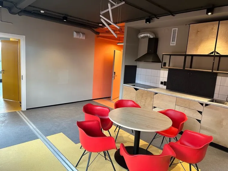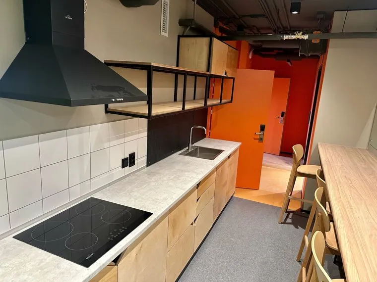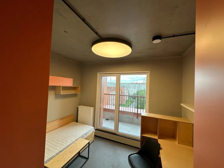 Каждый номер рассчитан на двух человек и оснащен собственным санузлом. Кухонные и обеденные зоны общего пользования распределены по блокам из двух-трех комнат. В общежитии также созданы общественные пространства и учебные комнаты, а в скором времени планируется открытие магазинов на цокольном этаже.