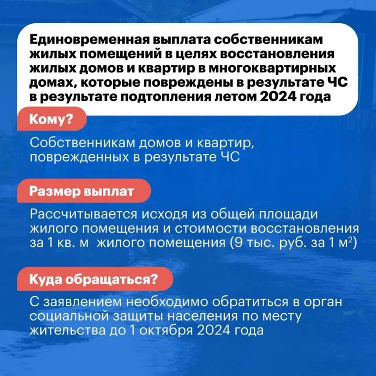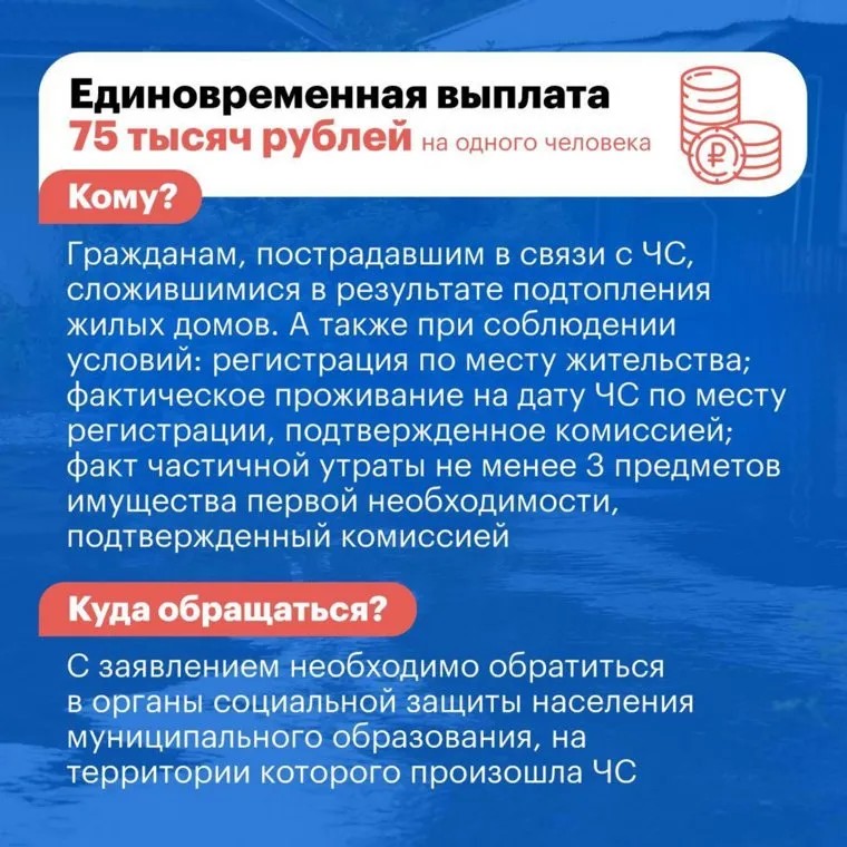 «Размер единовременных выплат составляет от 20 до 150 тысяч рублей за одного человека при повреждении имущества. При утрате жилого помещения будет выплачено 94 011 рублей за 1 квадратный метр жилья согласно рычночной стоимости», — уточнили в пресс-службе правительства региона.