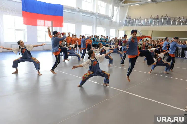 Перед выступлением губернатора прозвучал гимн, а школьники исполнили народный танец