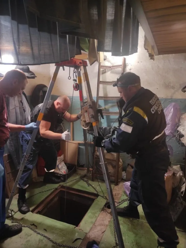 В Нижнем Тагиле (Свердловская область) женщина надышалась краской в овощной яме и потеряла сознание. Ее вытащили спасатели при помощи треноги.
