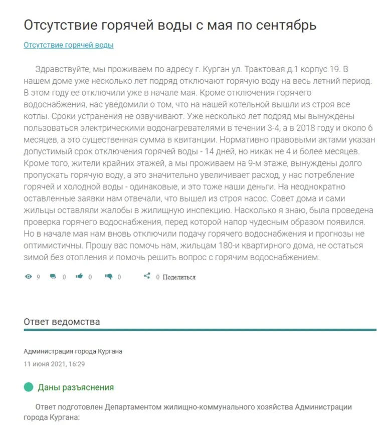 Жильцы неоднократно обращались с жалобами в городскую администрацию и ГЖИ. Так, в 2021 году в мэрии отсутствие воды объяснили технологическими нарушениями на котельной по ул. Трактовая. Обслуживающая организация планировала закупить и смонтировать необходимое оборудование, писали чиновники. ГЖИ не смогла провести по жалобе проверку, так как МУП «Прометей» не предоставил документы. В 2024 году на жалобу жильцов из ГЖИ направили ответ с ошибочным адресом.