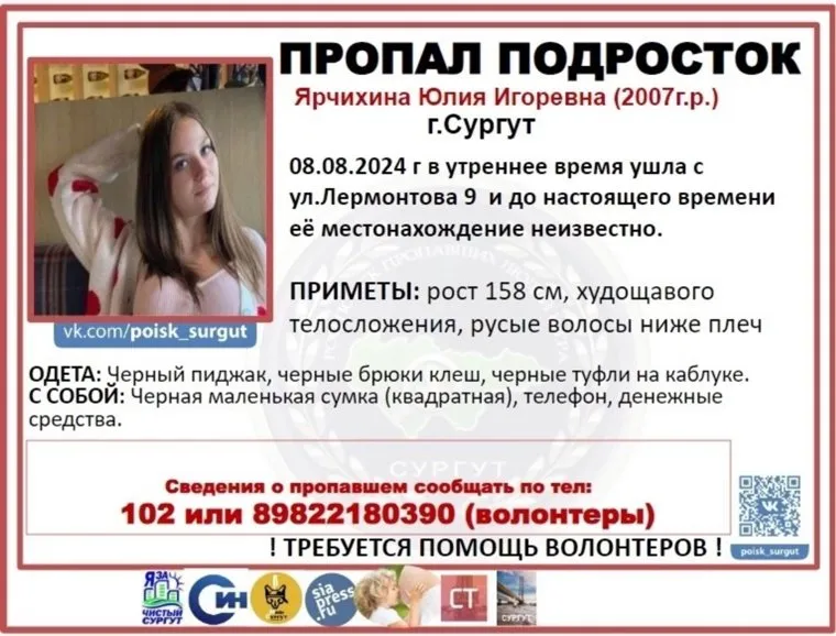 «Внимание, Сургут, пропал подросток. Ярчихина Юлия 2007 года рождения 8 августа 2024 года в утреннее время ушла с улицы Лермонтова, 9 и до настоящего времени ее местонахождение не известно», — сообщают волонтеры отряда «Поиск пропавших людей — Югра» в соцсети «ВКонтакте».