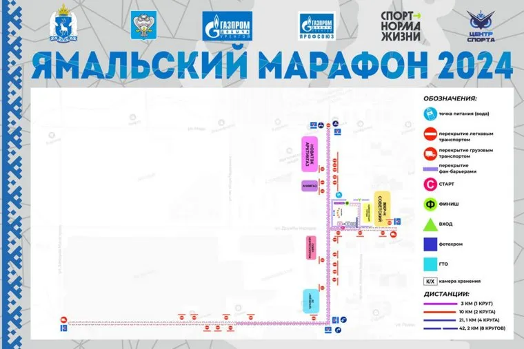 «В связи с проведением забега „Ямальский марафон 2024“ 10 августа 2024 года с 08:30 до 16:00 будут закрыты для движения автотранспорта участки автомобильных дорог. Объезд закрытых участков осуществлять по улицам Мира, имени Подшибякина В.Т., Центральной магистрали, Западной магистрали», — написали в официальном telegram-канале департамента строительства и жилищно-коммунального комплекса в городе Новый Уренгой.
