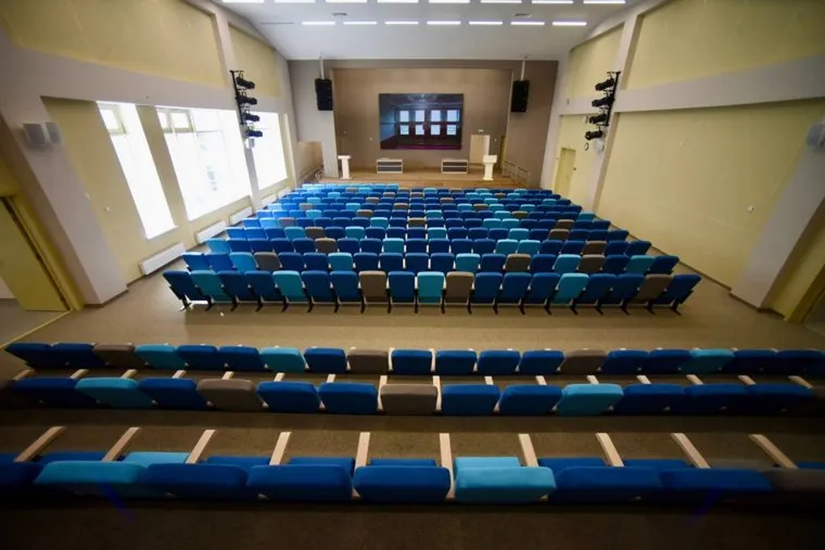 Актовый зал школы выдержан в голубых и бежевых тонах