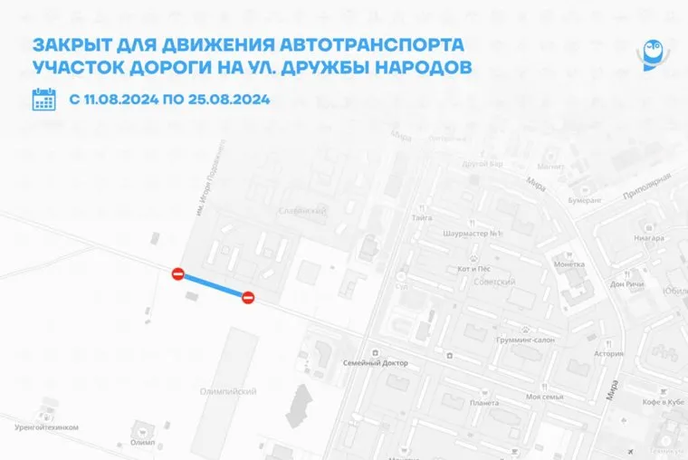 «С 11 по 25 августа 2024 года закрывается для движения автотранспорта участок дороги на улице Дружбы Народов от перекрестка с улицы имени Игоря Подовжнего на протяжении 50 метров. На участке запланированы работы по строительству инженерных коммуникаций», — написали в официальном telegram-канале администрации Нового Уренгоя.
