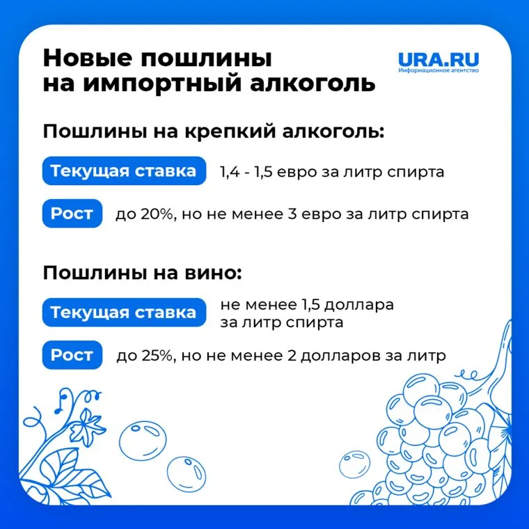 Ранее ставка пошлины на импортный крепкий алкоголь не зависела от его стоимости и составляла 1,4–1,5 евро за литр. Таким образом, за бутылку объемом 0,7 литра импортеры уплачивали около 1 евро. Под новые условия минимальная пошлина составляет 3 евро за литр чистого спирта, что эквивалентно примерно 0,8 евро за бутылку 0,7 литров. Это означает, что для продукции стоимостью менее 5 евро пошлина фактически уменьшилась.