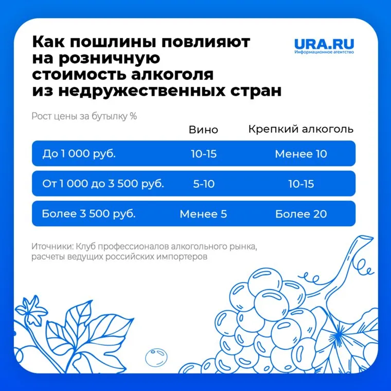 Александр Липилин из компании Fort предполагает, что после повышения пошлин найти вино из недружественных стран дешевле 1000 рублей станет затруднительно. Он оценивает предстоящее удорожание для данной категории продукции в 10%, а для более дорогих вин — в 7%.