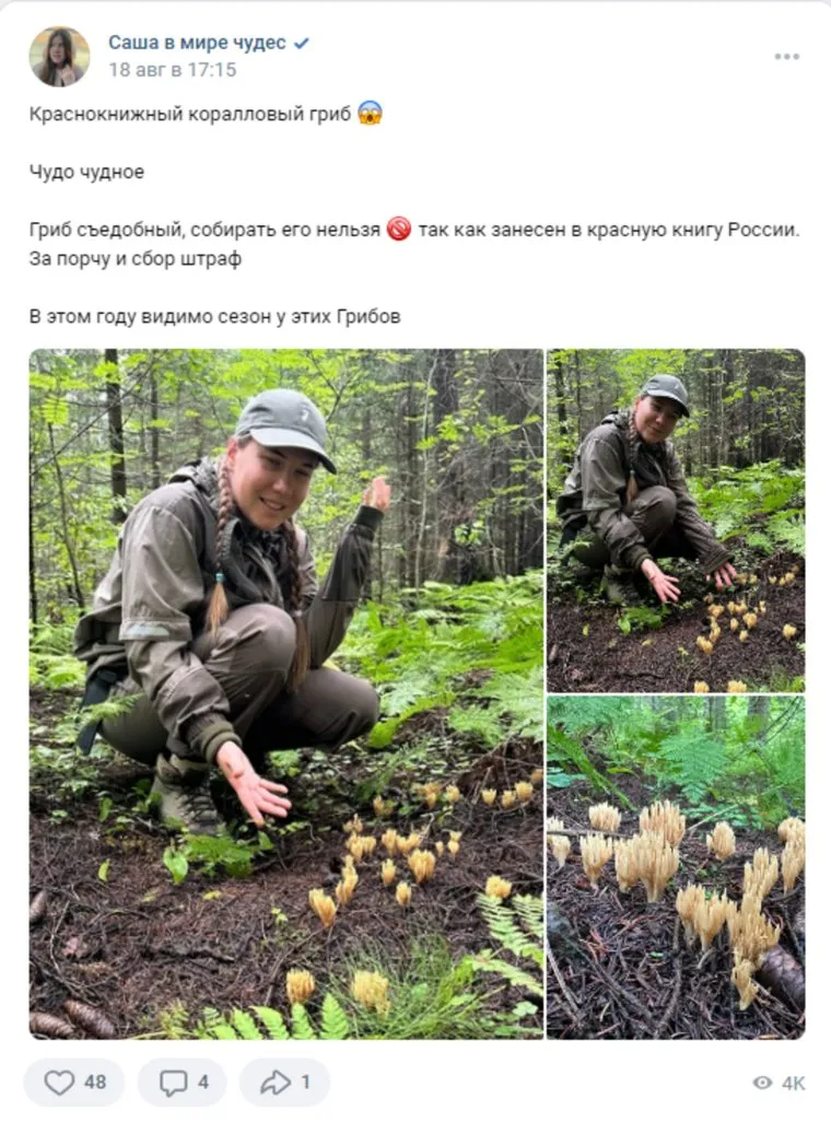 «Краснокнижный коралловый гриб! Чудо чудное. Гриб съедобный, но собирать его нельзя, так как занесен в Красную книгу России. За порчу и сбор штраф. В этом году видимо сезон у этих грибов», — пишет в соцсети «ВКонтакте» Александра Вяткина. Подписчики соглашаются с ней, отмечая, что в этом году часто видят эти грибы в пермских лесах.