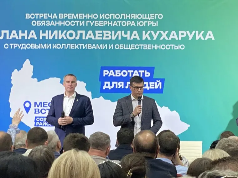 Врио губернатора ХМАО Руслан Кухарук и глава Советского района Евгений Буренков на встрече с жителями