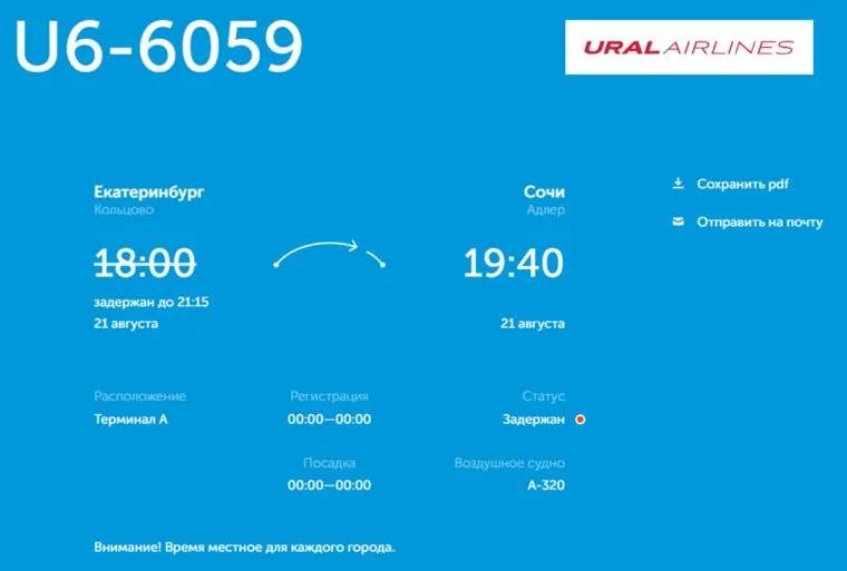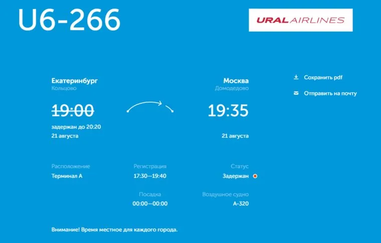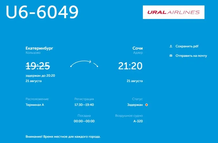Рейс U6-266 в Москву должен был отправиться из Екатеринбурга в 19:00, но задержан до 20:00. Вылет рейса U6-6049 в Сочи перенесли с 19:25 до 20:00, второй самолет в Сочи рейса U6-6059 задержан с 18:00 до 21:15.