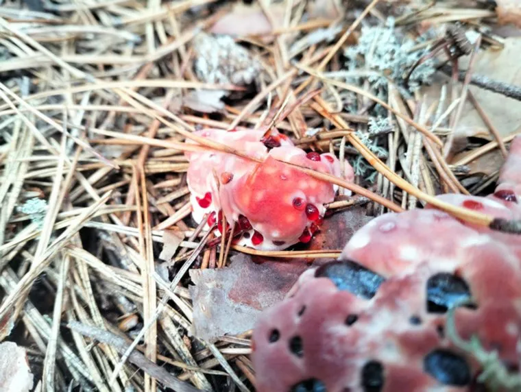 Этот уникальный гриб, известный как «зуб дьявола», также обнаружен в Свердловской области. Он привлекает насекомых красной жидкостью, напоминающей кровь, и использует их для питания. Гиднеллум Пека является несъедобным, но и неядовитым.