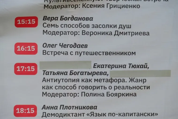 Правозащитницу Еву Меркачеву, писательницу Ольгу Птицеву и главного редактора издательства «Альпина нон-фикшн» Павла Подкосова вычеркнули из программы «Красной строки». Спикеры должны были вступать на фестивале в Екатеринбурге в эти выходные. Массовую отмену выступлений литераторов заметил общественник Владислав Постников.