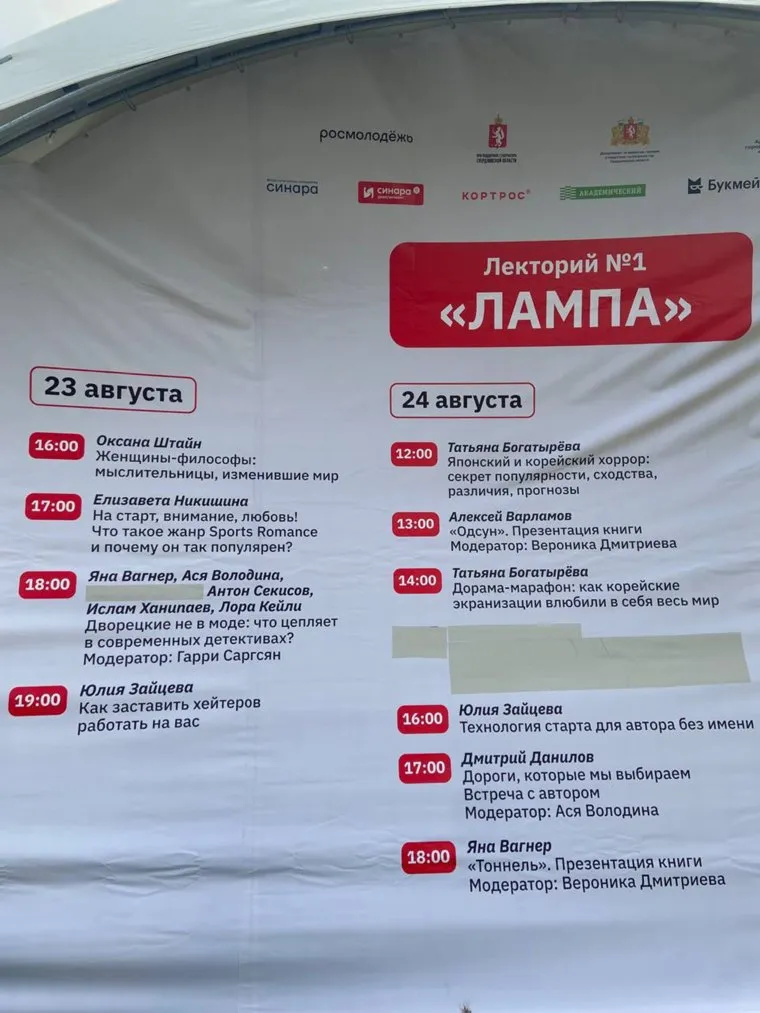 Также ранее отменилось выступление основателя фонда «Город без наркотиков» Андрея Кабанова. Его презентация новой книги о криминальном Екатеринбурге планировалась 23 августа, но организаторы сообщили, что встреча отменятся из-за состояния здоровья писателя.