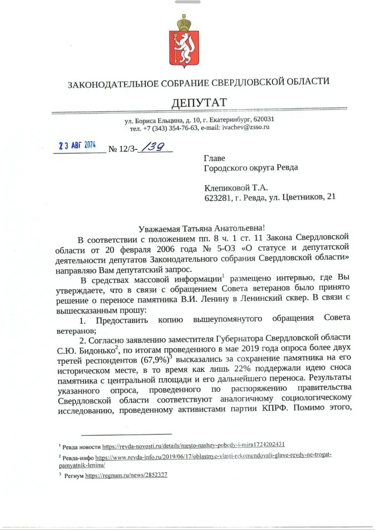 По его словам, глава Ревды обосновывает решение по демонтажу тем, что совет ветеранов поддержал перенос памятника. Несмотря на это, секретарь обкома направил депутатский запрос, в котором просит объяснить решение Клепиковой о переносе монумента.