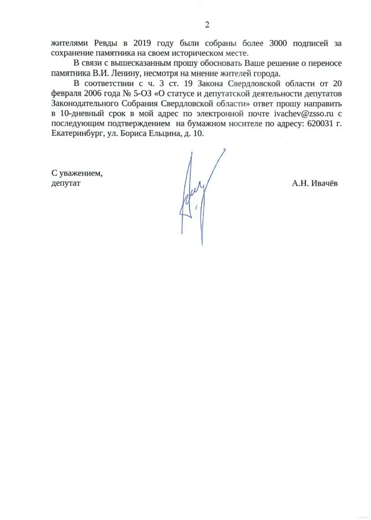 «Госпожа Клепикова фактически шантажирует жителей, утверждая, что реконструкция площади с установкой фонтана и сохранением памятника невозможна… Изначальный проект благоустройства площади Победы, разработанный самой администрацией Ревды, не предусматривал перенос памятника Ильичу. Рядом планировалось смонтировать фонтан. И одно другому не мешает, и финансирование проекта от этого никак не зависит», — сказал Ивачев. Его обращение к Клепиковой датировано 23 августа.