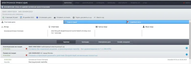 «Блиновская Елена обратилась в Арбитражный суд г. Москвы с заявлением <...> о признании недействительным решения от 24.10.2023г. № 20-07/2737 о привлечении к ответственности за совершение налогового правонарушения», — говорится в постановлении Арбитражного суда. Суд оставил жалобу без удовлетворения.