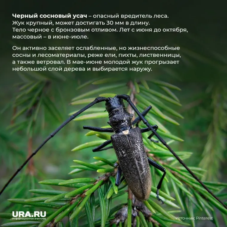 Большой черный сосновый усач, известный своими разрушительными способностями, впервые за пять лет был замечен на территории Курганской области. Насекомое представляет серьезную угрозу для лесных массивов. Этот крупный жук, достигающий в длину до 30 мм и имеющий черное тело с бронзовым отливом, активен с июня по октябрь, с пиком активности в июне-июле. URA.RU расскажет, что это за насекомое и как с ним бороться.