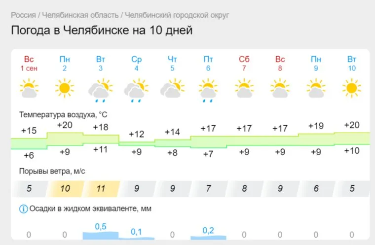 «В понедельник, 2 сентября, в Челябинске днем потеплеет до 20 градусов. Будет стоять ясная солнечная погода, осадки не прогнозируются», — сообщается в прогнозе на сайте «Гисметео».