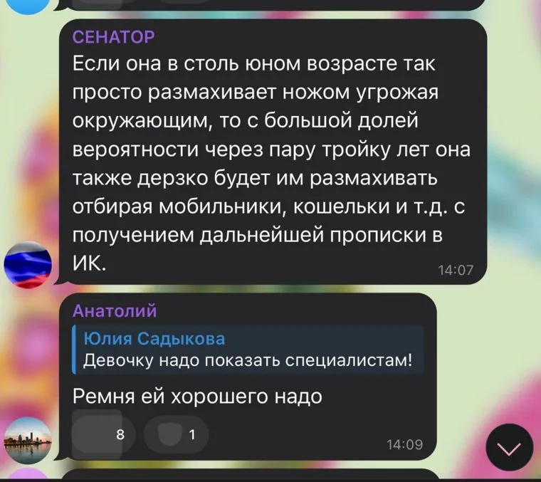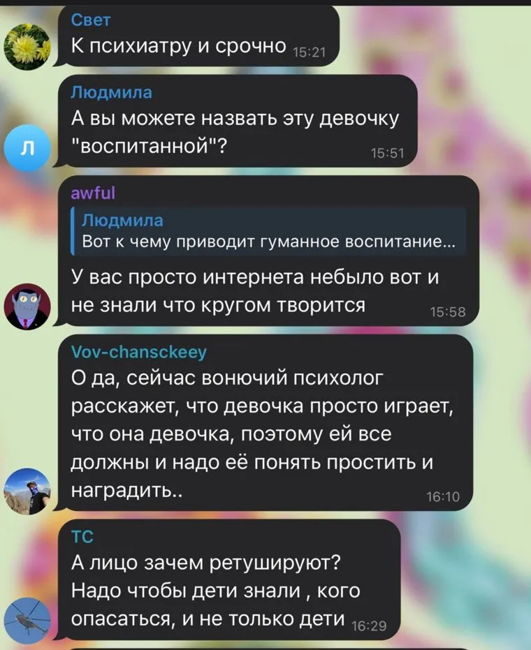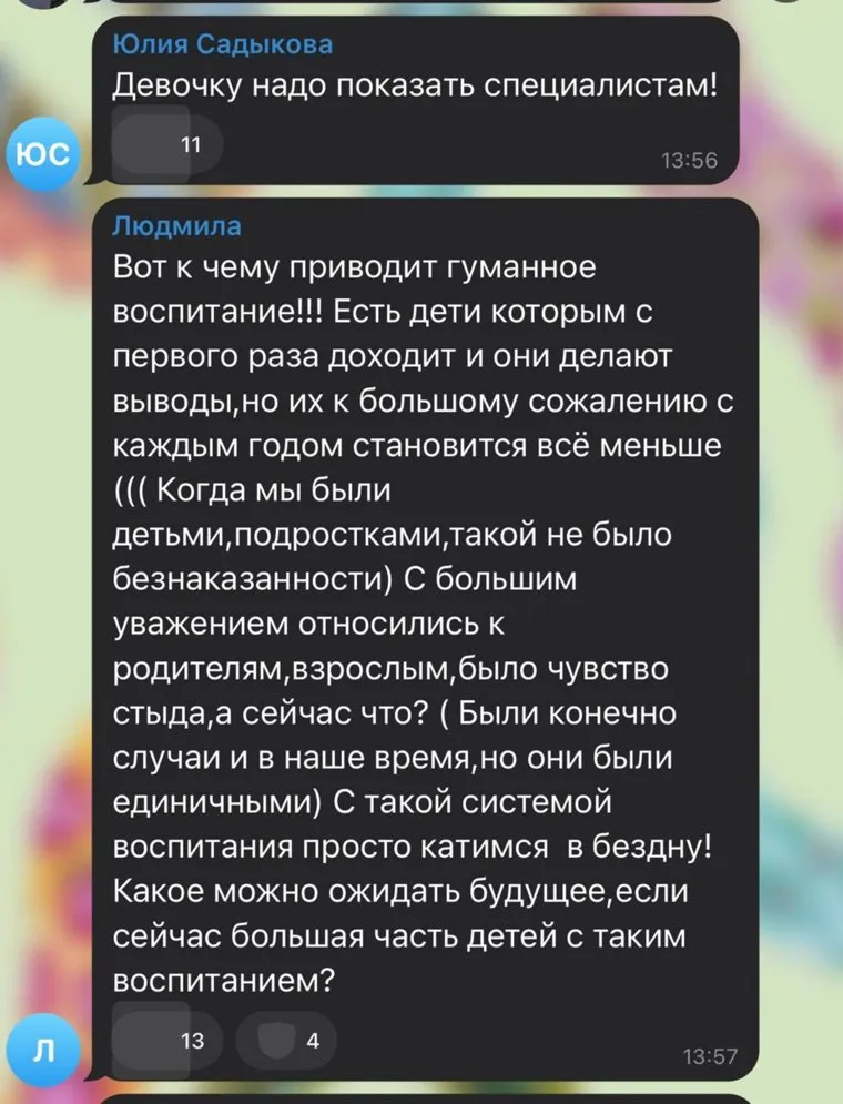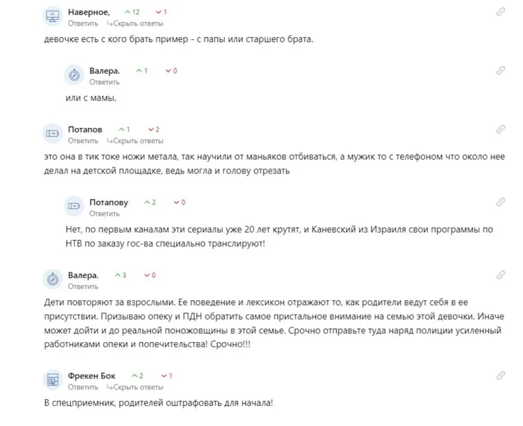 «Дети повторяют за взрослыми. Ее поведение и лексикон отражают то, как родители ведут себя в ее присутствии. Призываю опеку и ПДН обратить самое пристальное внимание на семью этой девочки. Иначе может дойти и до реальной поножовщины в этой семье. Срочно отправьте туда наряд полиции, усиленный работниками опеки и попечительства! Срочно!» — написал комментатор.