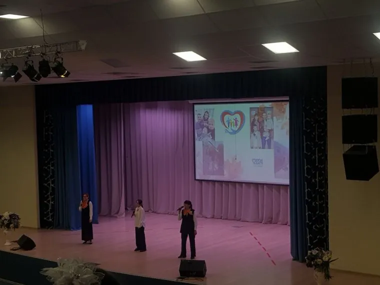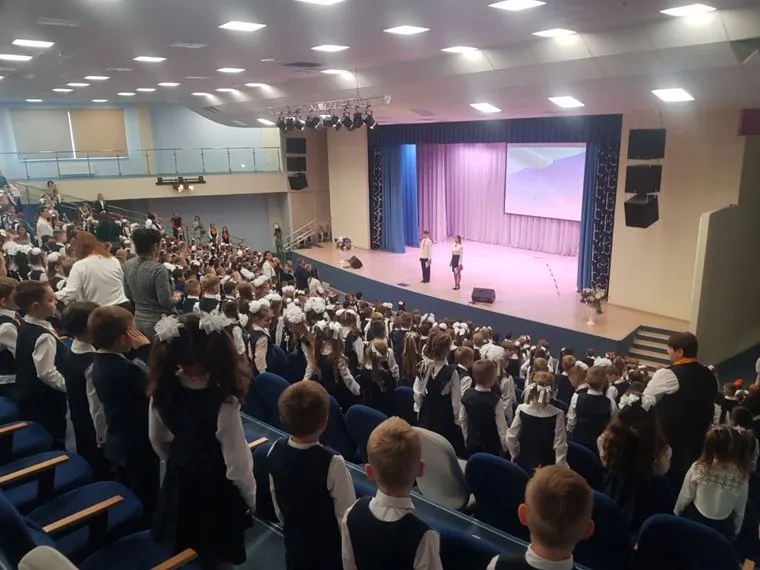 10:44 Линейку в школе №23 завершают гимном семьи. На сцене поют учителя. Позади на экране фотографии учеников с родителями сменяют друг друга.