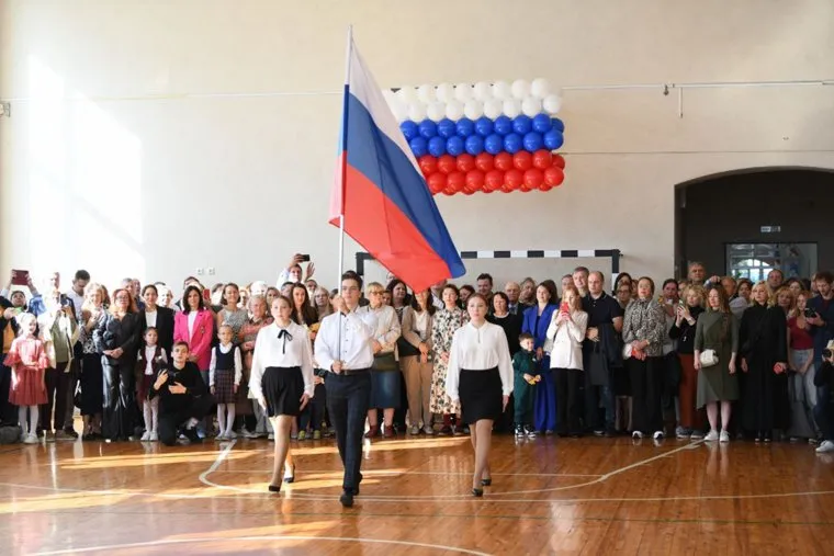 12:19 На линейку новой школы №133 в Академическом районе собрали 14 первых классов (ранее заявляли о 16-ти). Ко входу учреждения вынесли знамя, звучит гимн.