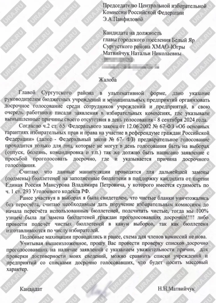 «Главой Сургутского района в ультимативной форме дано указание руководителям бюджетных учреждений и муниципальных предприятий организовать досрочное голосование среди сотрудников учреждений и предприятий, в свою очередь работники писали заявления в избирательных комиссиях, где указывали вымышленные причины своего отсутствия в день голосования — 8 сентября 2024 года. Считаю, что данные манипуляции проводятся для дальнейшей замены (подмены) бюллетеней на заполненные бюллетени в поддержку кандидата от партии „Единая Россия“ Мансурова Владимира Петровича», — указано в документе.