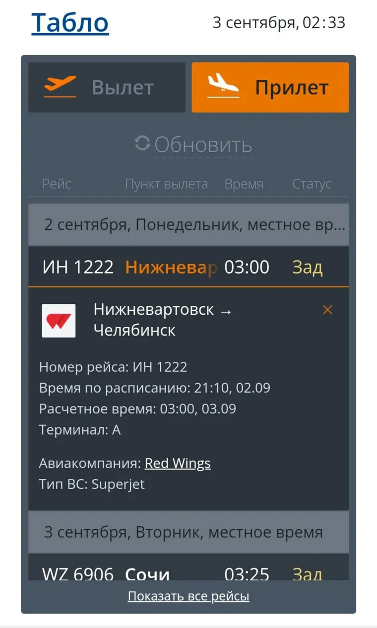 «Рейс ИНН 1222 Нижневартовск-Челябинск задерживается. Время по расписанию: 21:10, 02.09. Расчетное время: 03:00, 03.09», — указано на онлайн-табло аэропорта имени Игоря Курчатова. Рейс выполнялся на самолете Superjet.