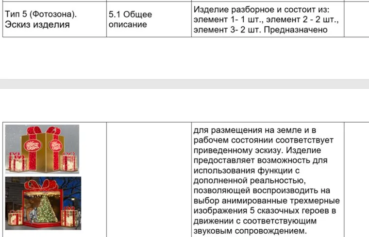 «Изделие предоставляет возможность для использования функции с дополненной реальностью, позволяющей воспроизводить на выбор анимированные трехмерные изображения пяти сказочных героев в движении с соответствующим звуковым сопровождением», — указано в описании елочной фотозоны за 2,4 миллиона. За поставку пяти цветных изделий, «имеющих форму гриба» власти готовы заплатить почти три миллиона.
