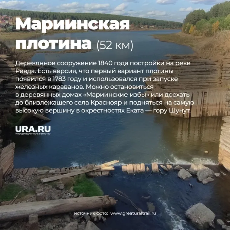Ближе всего к Екатеринбургу располагаются озеро Песчаное и гора Пшеничная (30 км), уникальная лиственничная Мариинская плотина (52 км) длиной около 320 метров и Тальков камень с озером в форме сердца в природном парке «Бажовские места» (56 км). Все площадки находятся в Свердловской области.