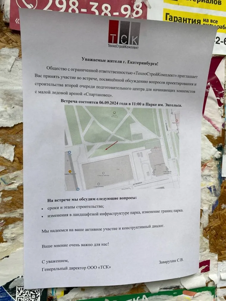 «Уважаемые жители Екатеринбурга! ООО „ТехноСтройКомплект“ приглашает вас принять участие во встрече, посвященной обсуждению вопросов проектирования и строительства второй очереди подготовительного центра для начинающих хоккеистов с малой ледовой ареной „Спартаковец“», — говорится в объявлении. Встречу с жителями Екатеринбурга застройщик назначил на 6 сентября 2024 года. Академия хоккея «Спартаковец» находится на ул. Энгельса, 31А.