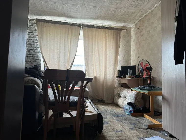 Виден расправленный диван и покосившаяся гардина. Стоит шкаф, вентилятор и прочая техника. На полу валяются пятилитровая бутылка из-под воды, бумаги и мусор.